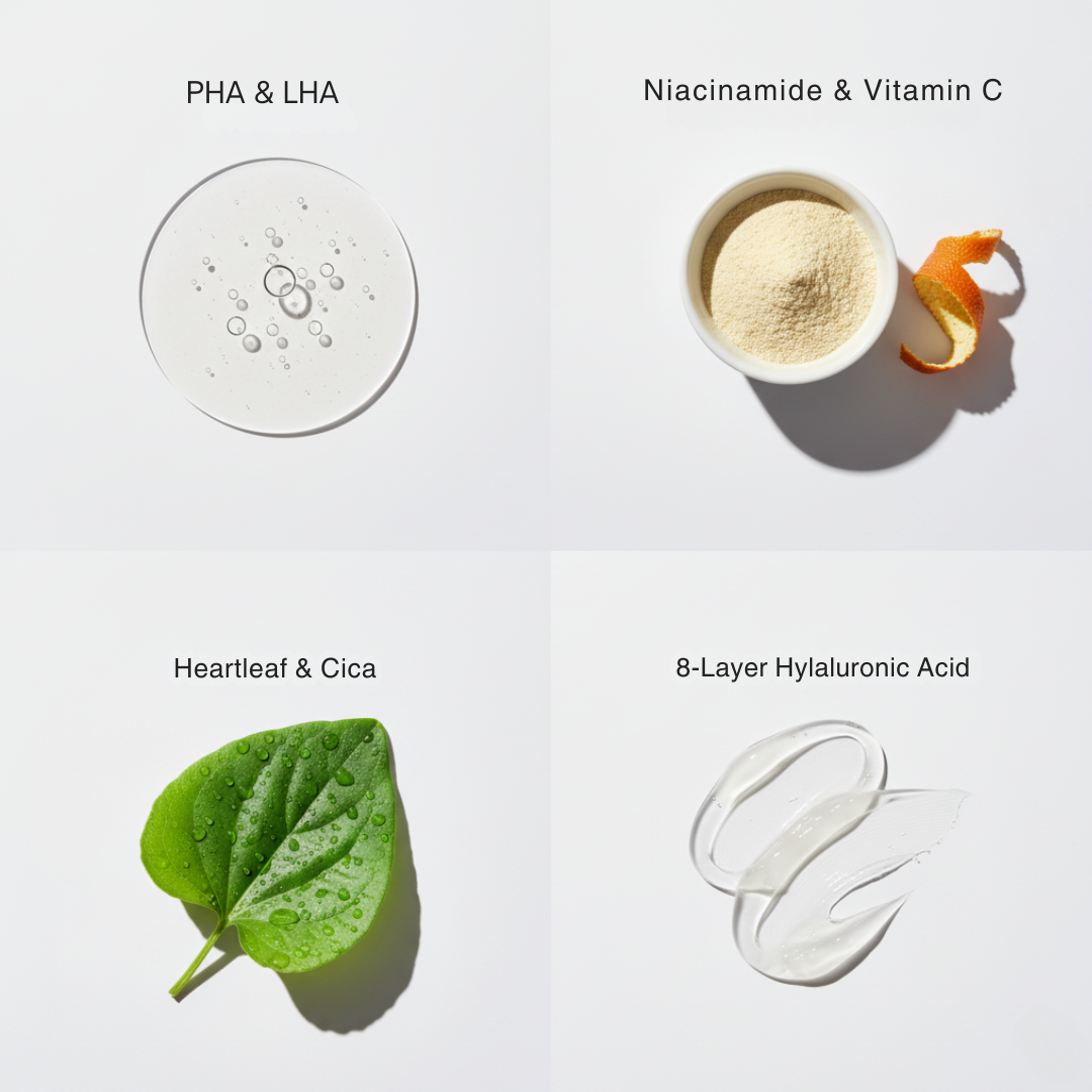 Our formula uses a powerful blend of PHA and LHA, advanced acids that effectively clear pores and smooth texture without the harshness and irritation of traditional exfoliants.